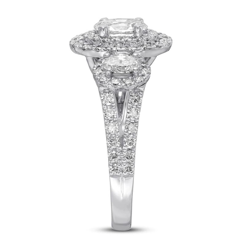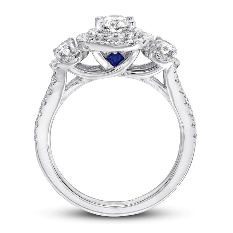 , this captivating 3-stone engagement ring showcases a trio of oval diamonds. Set beneath the bezel of the largest stone are two princess-cut sapphires, the signature of the collection and symbol of everlasting love. The polished band is lined with round accent diamonds on all sides, ensuring sparkle from any angle. Set in 14K white gold with a total diamond weight of 1 1/2 carats, this engagement ring is a brilliant beginning to your romantic love story.
